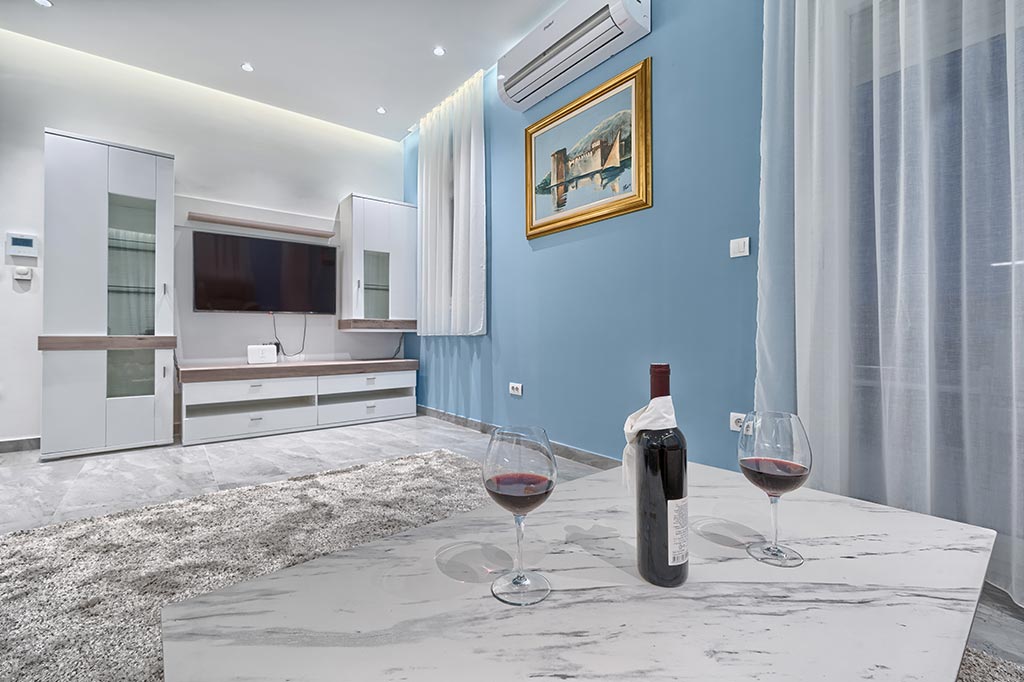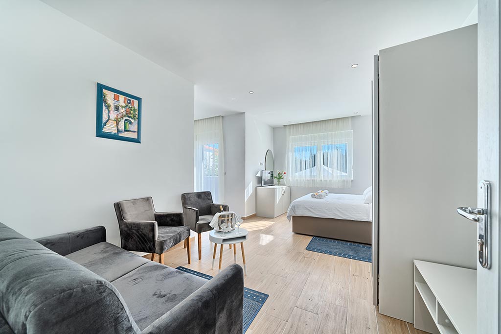 Apartman je opremljen sa klima uređajem, mini barom te TV-om sa satelitskim programom. Prostrani apartman ima 3 sobe i 2 balkona te je predviđen za boravak 5 osoba.